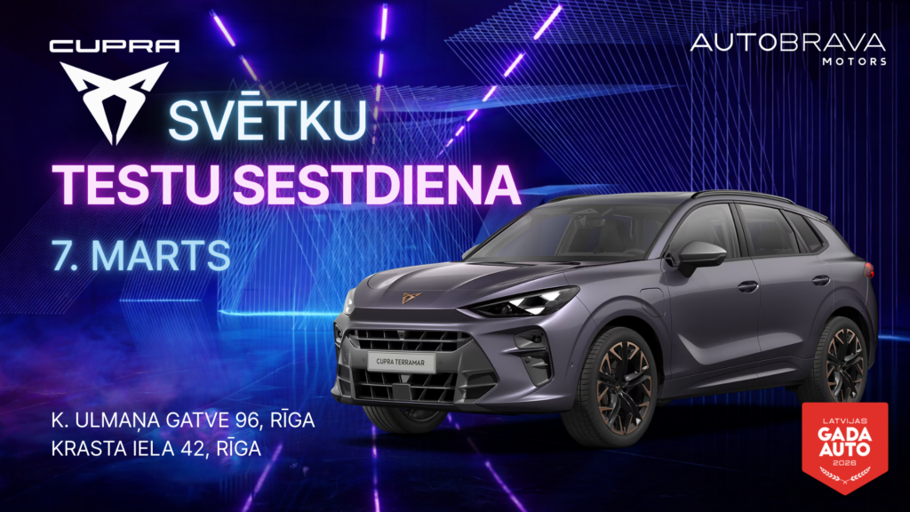 Notestē jebkuru CUPRA un iemīlies tajā! Izmēģini “Latvijas Gada Auto 2026” uzvarētāju CUPRA Terramar, kā arī citus populārus modeļus: sportisko CUPRA Formentor, stilīgo elektrisko CUPRA Tavascan – Gada dizaina balvas 2026 ieguvēju, un daudzus citus.